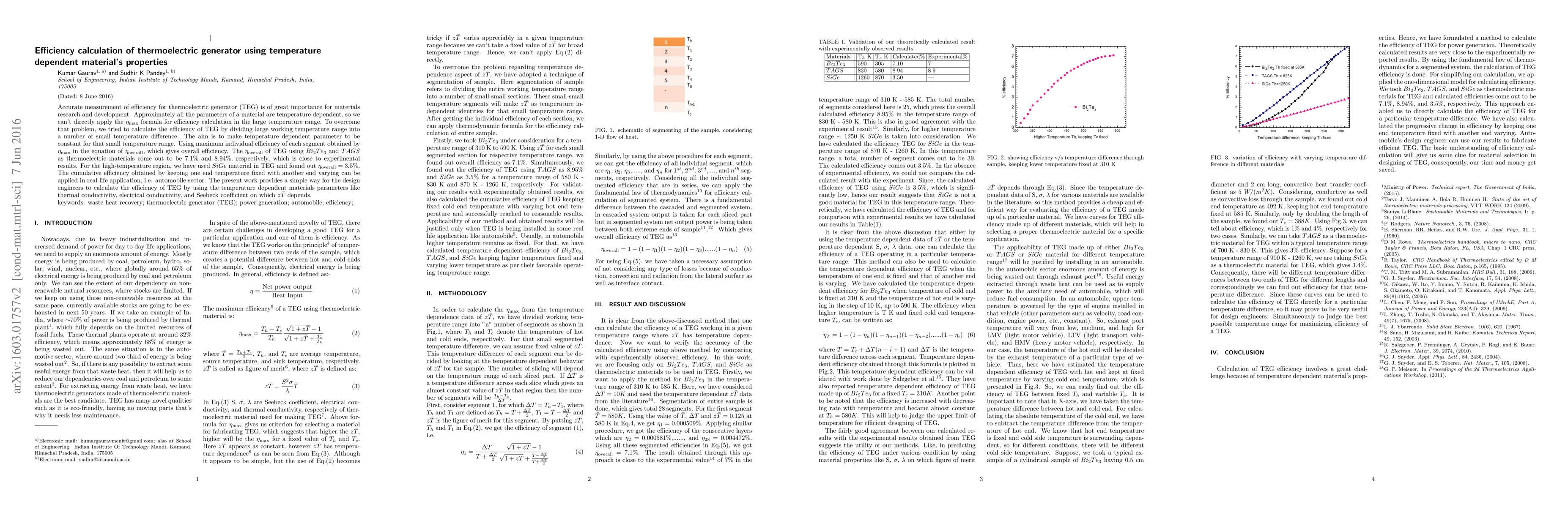 This paper proposes a method to calculate the efficiency of thermoelectric generators (TEGs) by segmenting the temperature range into smaller intervals, allowing for the use of the $\eta_\text{max}$ formula for each segment. The overall efficiency ($\eta_\text{overall}$) for TEGs using $Bi_2Te_3$, $TAGS$, and $SiGe$ materials is found to be 7.1%, 8.94%, and 3.5%, respectively, aligning closely with experimental results.