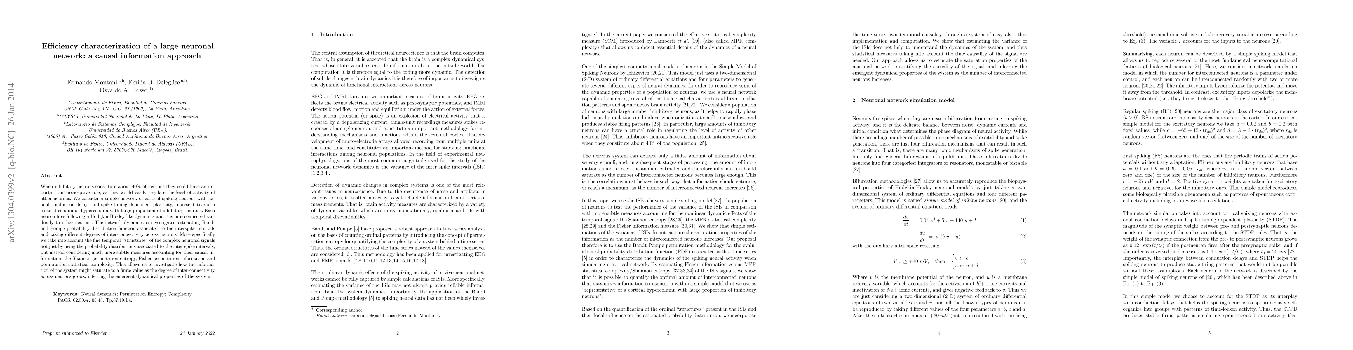 This paper investigates the efficiency of a large neuronal network with a significant proportion of inhibitory neurons using causal information measures. It explores the dynamics of the network through various inter-connectivity levels and employs Shannon permutation entropy, Fisher permutation information, and permutation statistical complexity to reveal the emergent dynamical properties as connectivity increases.