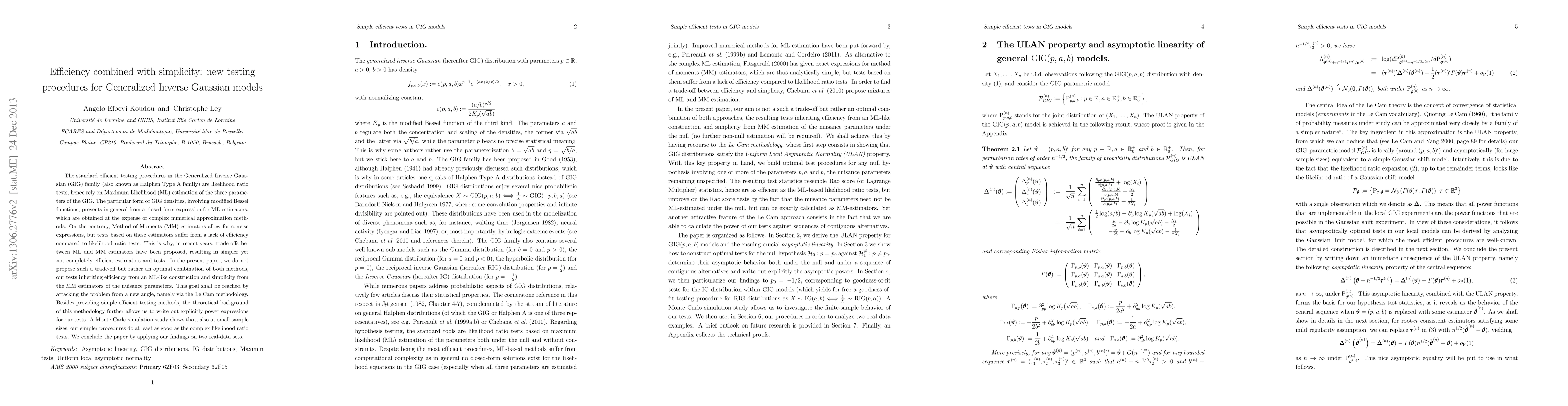 A new testing procedure for Generalized Inverse Gaussian models combines simplicity with efficiency, offering a more effective balance between the two in a novel application of Le Cam methodology.