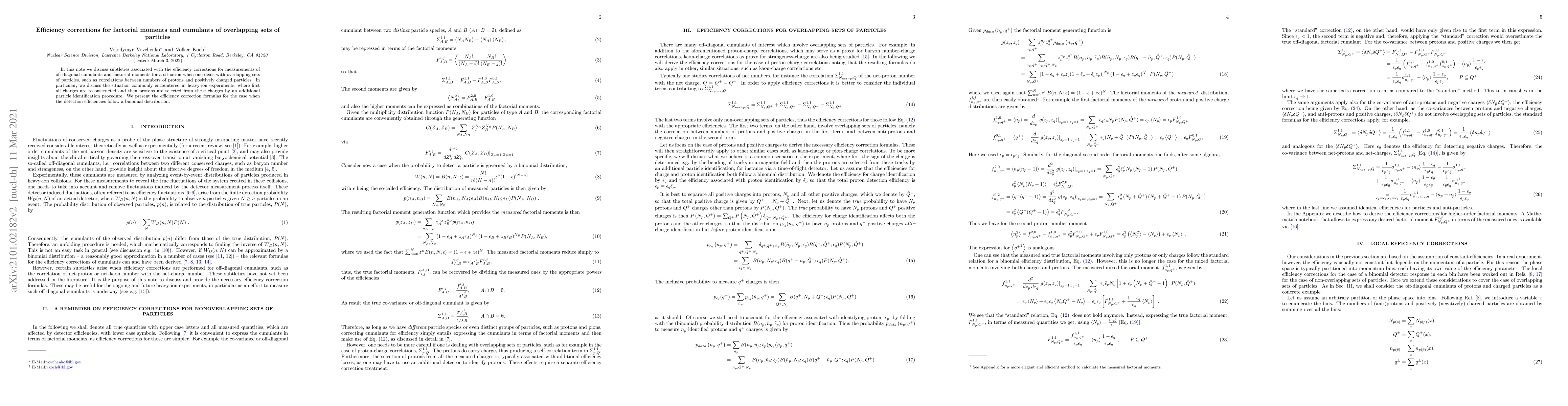 This paper addresses the efficiency corrections needed for measuring off-diagonal cumulants and factorial moments in overlapping particle sets, such as proton-charge correlations in heavy-ion experiments. It provides formulas for these corrections when detection efficiencies follow a binomial distribution.
