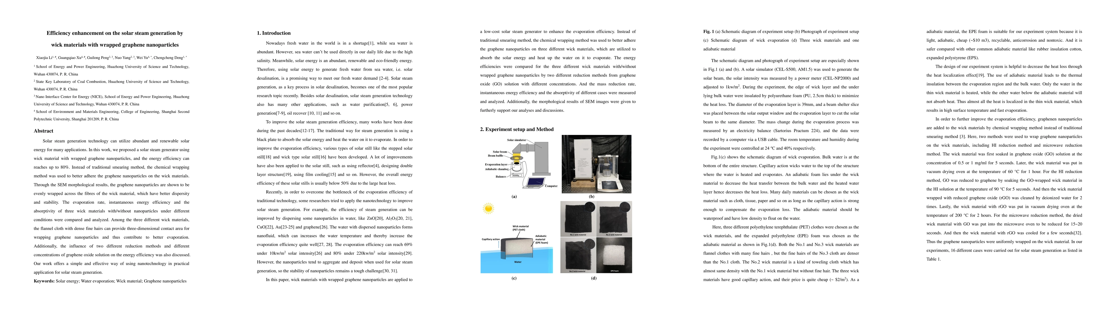 This paper proposes a solar steam generator using wick materials wrapped with graphene nanoparticles, achieving an energy efficiency of up to 80%. The chemical wrapping method enhances graphene adherence, leading to better dispersion and stability, and flannel cloth provides optimal three-dimensional contact for improved evaporation.