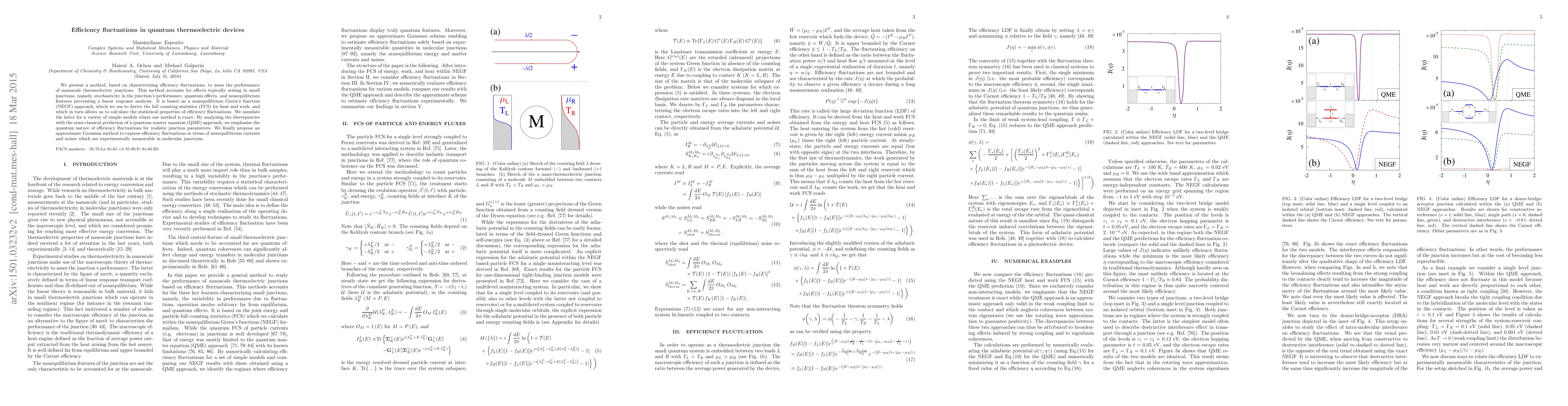 We present a method, based on characterizing efficiency fluctuations, to asses the performance of nanoscale thermoelectric junctions. This method accounts for effects typically arising in small junctions, namely, stochasticity in the junction's performance, quantum effects, and nonequilibrium features preventing a linear response analysis. It is based on a nonequilibrium Green's function (NEGF) approach, which we use to derive the full counting statistics (FCS) for heat and work, and which in turn allows us to calculate the statistical properties of efficiency fluctuations. We simulate the latter for a variety of simple models where our method is exact. By analyzing the discrepancies with the semi-classical prediction of a quantum master equation (QME) approach, we emphasize the quantum nature of efficiency fluctuations for realistic junction parameters. We finally propose an approximate Gaussian method to express efficiency fluctuations in terms of nonequilibrium currents and noises which are experimentally measurable in molecular junctions.