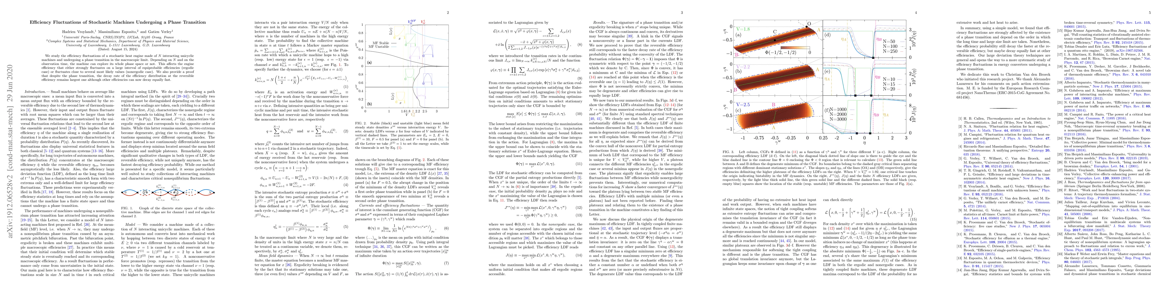 We study the efficiency fluctuations of a stochastic heat engine made of $N$ interacting unicyclic machines and undergoing a phase transition in the macroscopic limit. Depending on $N$ and on the observation time, the machine can explore its whole phase space or not. This affects the engine efficiency that either strongly fluctuates on a large interval of equiprobable efficiencies (ergodic case) or fluctuates close to several most likely values (nonergodic case). We also provide a proof that despite the phase transition, the decay rate of the efficiency distribution at the reversible efficiency remains largest one although other efficiencies can now decay equally fast.