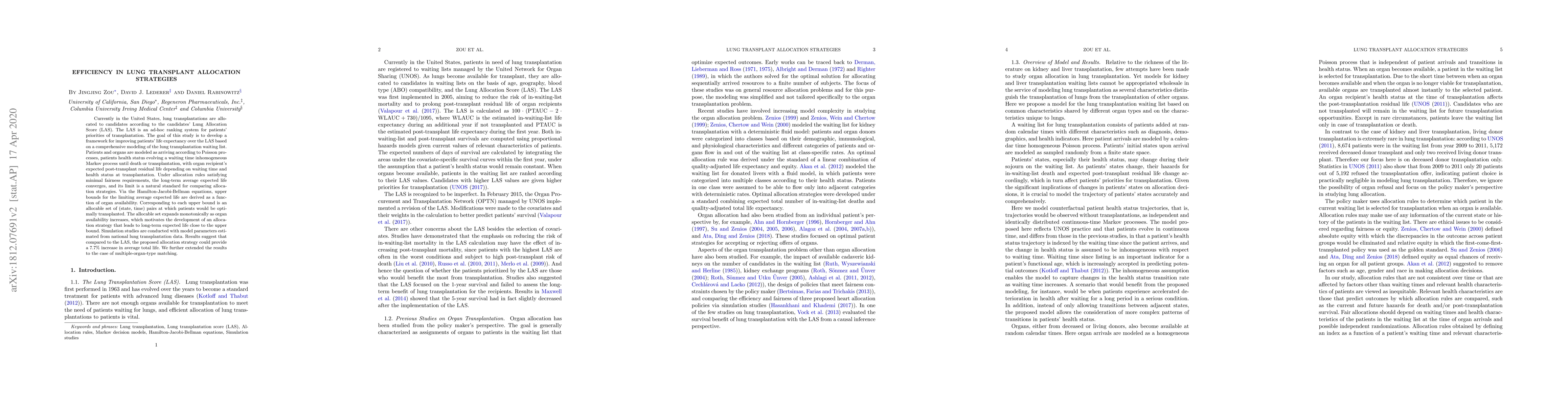 This study proposes a new lung transplant allocation strategy based on a comprehensive mathematical model that aims to improve patients' life expectancy compared to the current Lung Allocation Score system. The model incorporates patient health status dynamics and organ availability, leading to a potential 7.7% increase in average total life expectancy, with simulations validated using national transplantation data.