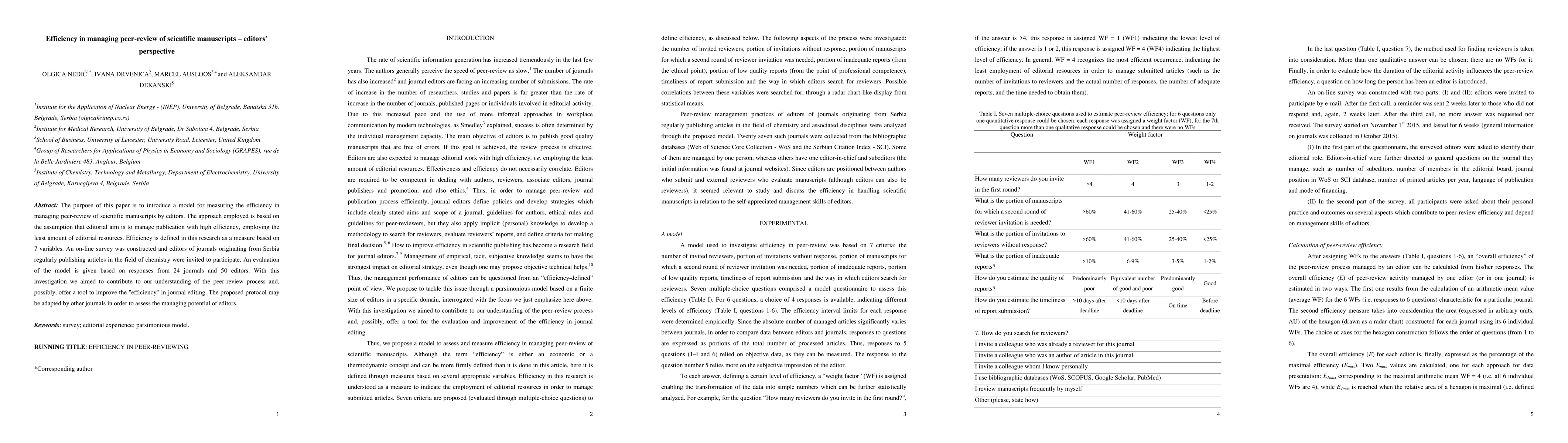 This paper proposes a model to measure the efficiency of scientific manuscript peer-review from editors' perspectives, based on seven variables. An online survey of Serbian chemistry journals' editors resulted in responses from 24 journals and 50 editors, aiming to enhance understanding and improve journal editing efficiency.