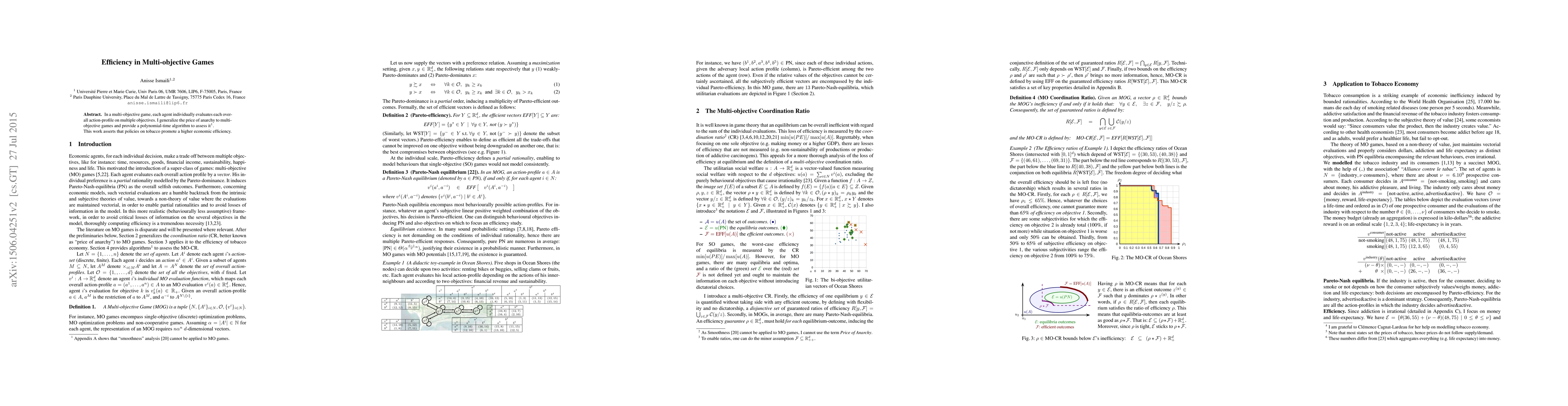 Summary: This paper generalizes the price of anarchy to multi-objective games and presents a polynomial-time algorithm to evaluate it, demonstrating that tobacco policies enhance economic efficiency. The study focuses on the efficiency of individual evaluations in multi-objective scenarios.