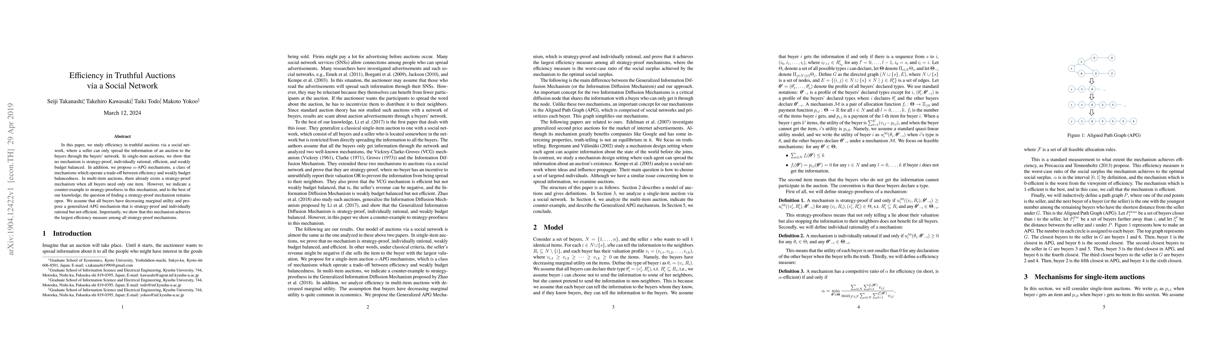This paper examines efficiency in truthful auctions within social networks, finding no single-item strategy-proof mechanisms that are also individually rational, efficient, and weakly budget-balanced. It introduces $alpha$-APG mechanisms balancing efficiency and budget constraints. For multi-item auctions, it presents a strategy-proof mechanism for buyers needing one item, but identifies a counter-example to its strategy-proofness. A generalized APG mechanism is proposed for multiple items, shown to be strategy-proof and individually rational, though not efficient, and proven to achieve maximum efficiency among strategy-proof mechanisms under decreasing marginal utility assumptions.