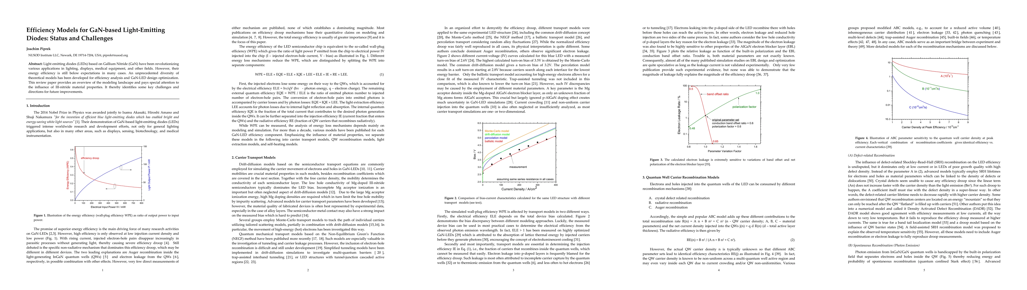 This paper reviews various efficiency models for GaN-based LEDs, highlighting the current limitations and challenges in achieving optimal energy efficiency. It emphasizes the role of III-nitride material properties and suggests future directions for model improvements.