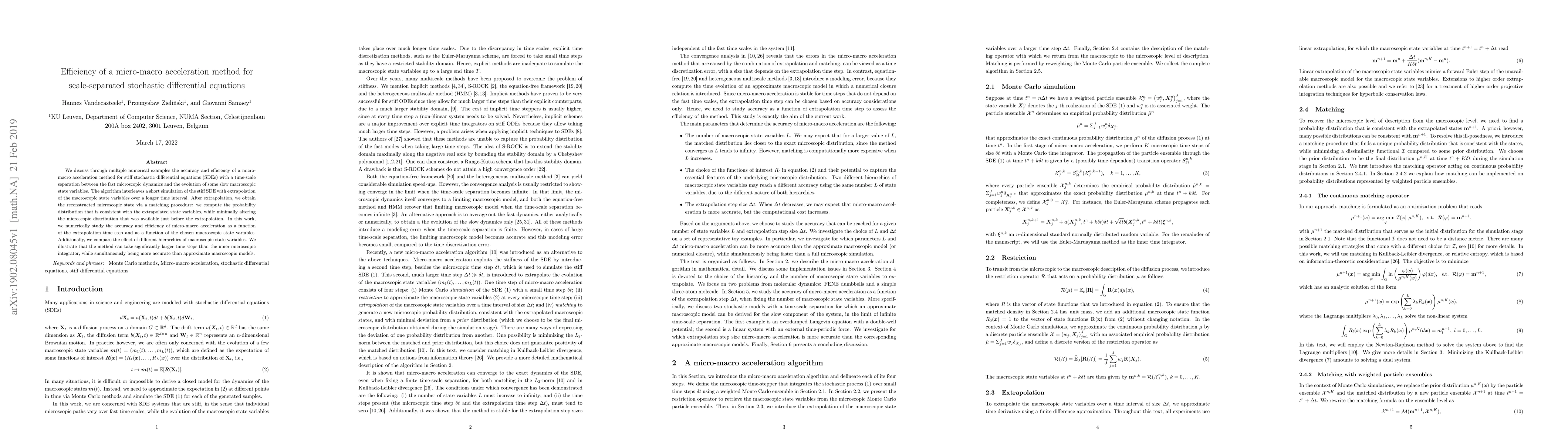 We discuss through multiple numerical examples the accuracy and efficiency of a micro-macro acceleration method for stiff stochastic differential equations (SDEs) with a time-scale separation between the fast microscopic dynamics and the evolution of some slow macroscopic state variables. The algorithm interleaves a short simulation of the stiff SDE with extrapolation of the macroscopic state variables over a longer time interval. After extrapolation, we obtain the reconstructed microscopic state via a matching procedure: we compute the probability distribution that is consistent with the extrapolated state variables, while minimally altering the microscopic distribution that was available just before the extrapolation. In this work, we numerically study the accuracy and efficiency of micro-macro acceleration as a function of the extrapolation time step and as a function of the chosen macroscopic state variables. Additionally, we compare the effect of different hierarchies of macroscopic state variables. We illustrate that the method can take significantly larger time steps than the inner microscopic integrator, while simultaneously being more accurate than approximate macroscopic models.