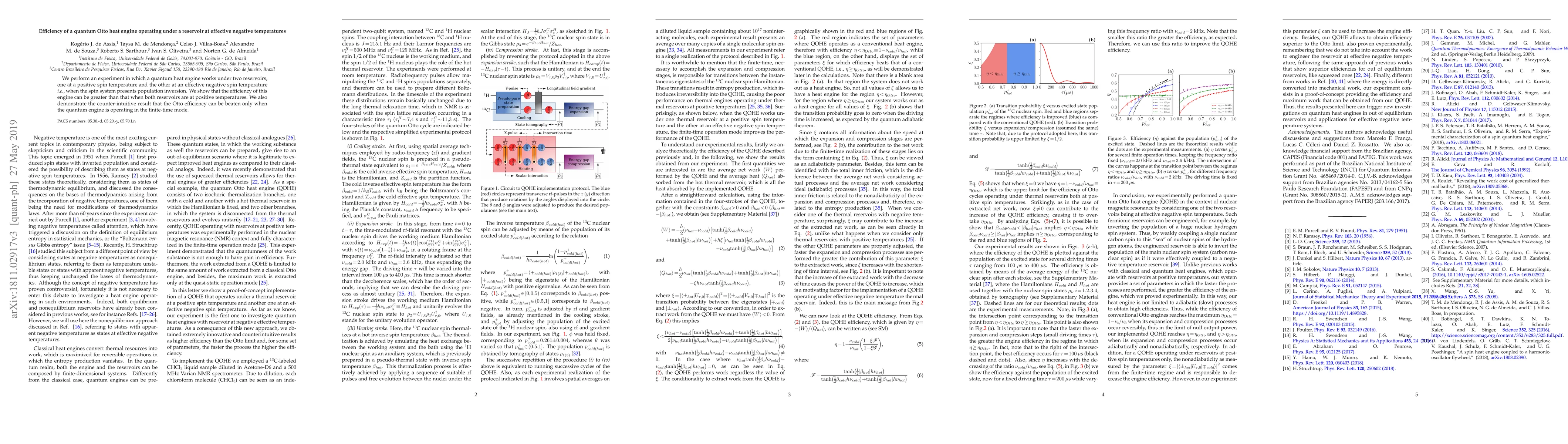 Abstract We perform an experiment in which a quantum heat engine works under two reservoirs, one at a positive spin temperature and the other at an effective negative spin temperature i.e., when the spin system presents population inversion. We show that the efficiency of this engine can be greater than that when both reservoirs are at positive temperatures. We also demonstrate the counter-intuitive result that the Otto efficiency can be beaten only when the quantum engine is operating in the finite-time mode.