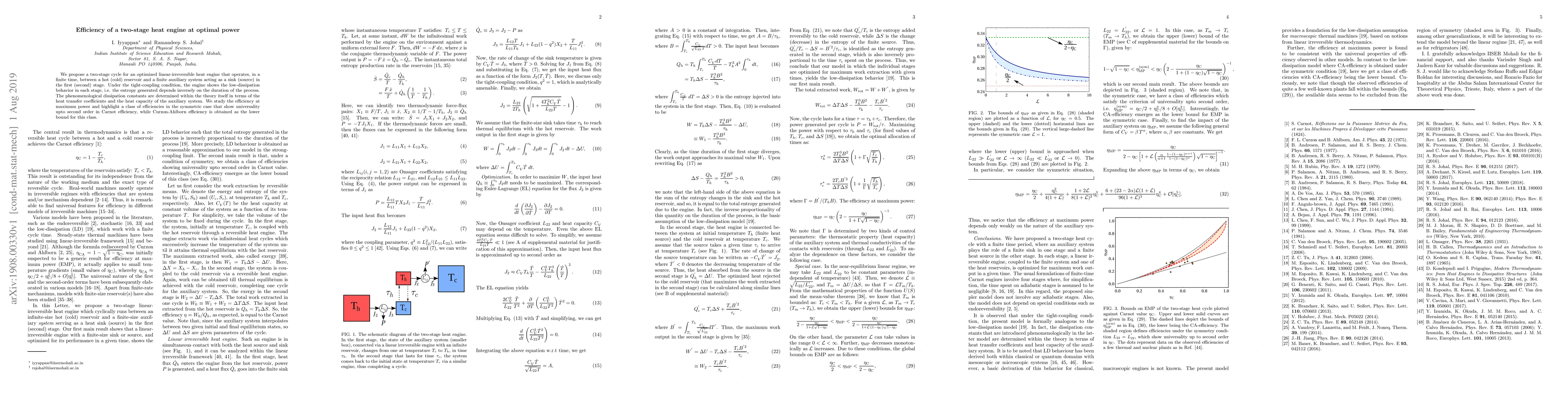 This paper proposes a two-stage heat engine cycle optimized for maximum power, demonstrating low-dissipation behavior under tight-coupling conditions. The efficiency at maximum power is analyzed, revealing a universal class of efficiencies up to second order in Carnot efficiency, with Curzon-Ahlborn efficiency as the lower bound.