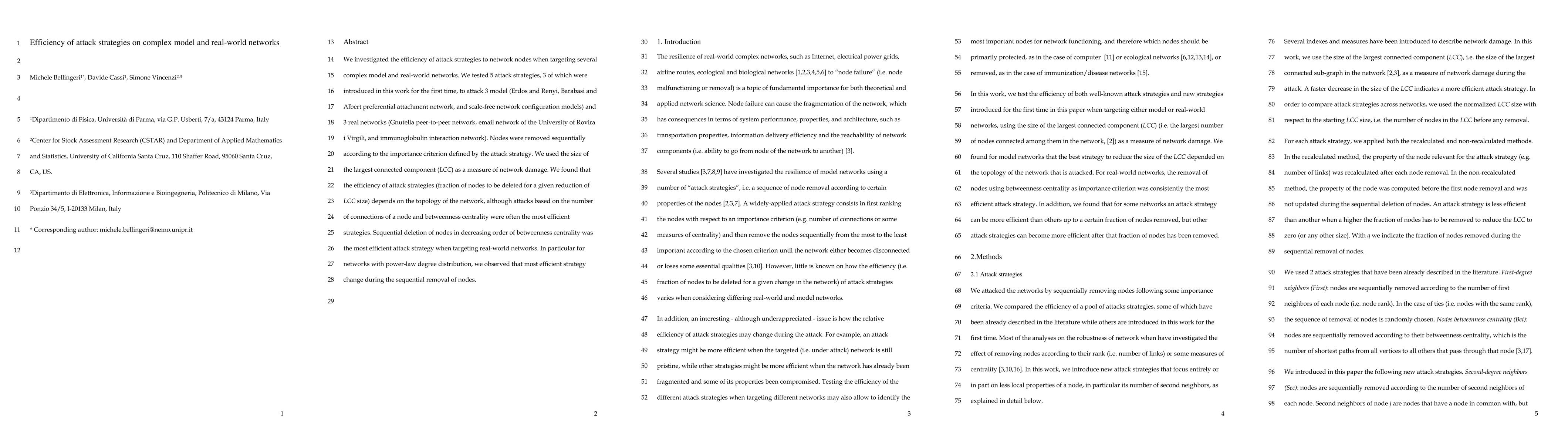 This study evaluates the efficiency of five attack strategies on both model and real-world networks, finding that strategy effectiveness varies with network topology. The most efficient strategies, particularly those based on node connections and betweenness centrality, often caused significant damage, with sequential node removal by decreasing betweenness centrality proving most effective for real-world networks.