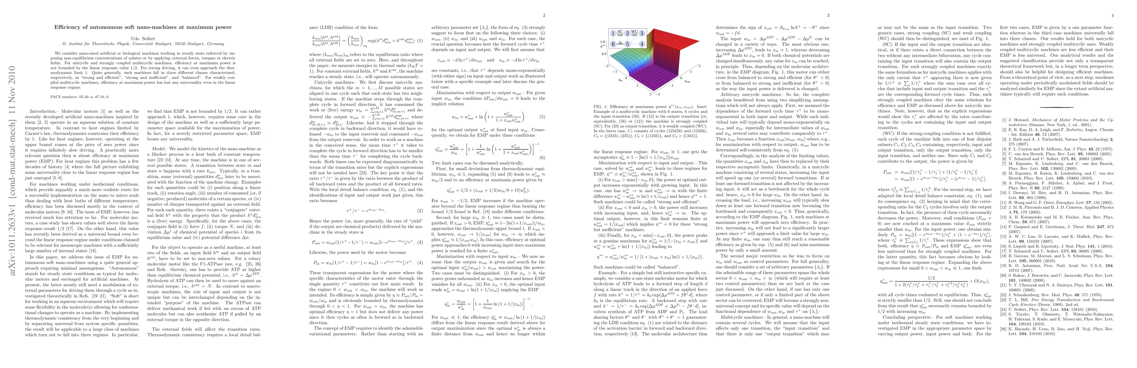 This paper explores the efficiency of autonomous soft nano-machines operating at maximum power, revealing that unicyclic and strongly coupled multicyclic machines can achieve efficiencies approaching the thermodynamic limit of 1, classifying them into "strong and efficient", "strong and inefficient", or "balanced" categories. In contrast, weakly coupled multicyclic machines lose universality in efficiency even in the linear response regime.