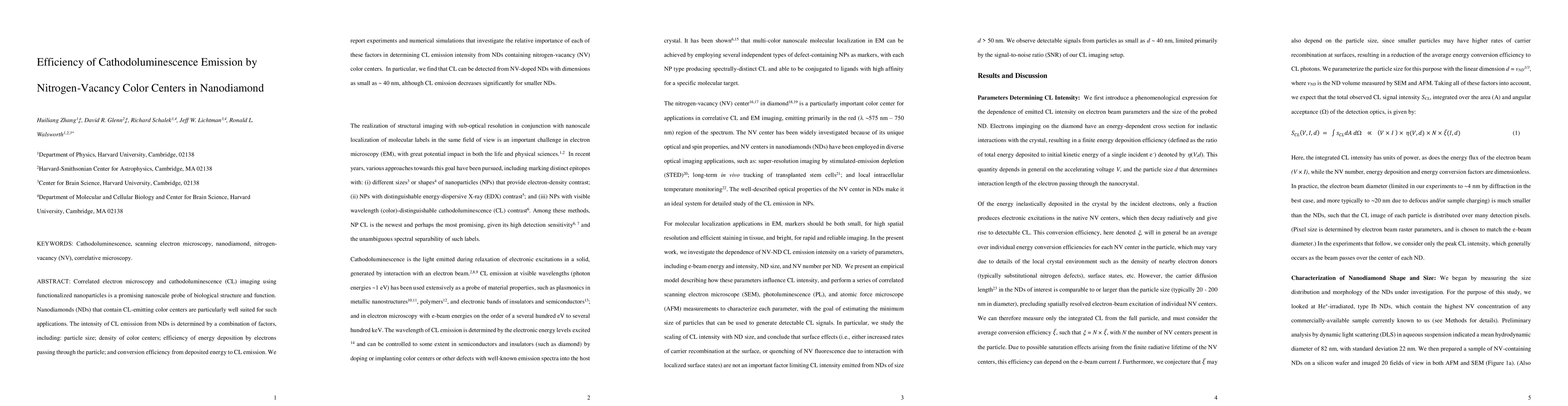 This paper investigates the efficiency of cathodoluminescence (CL) emission from nitrogen-vacancy (NV) color centers in nanodiamonds (NDs), finding that CL intensity depends on particle size, color center density, and energy conversion efficiency. Experiments and simulations reveal that CL can be detected from NV-doped NDs as small as ~40 nm, but diminishes for even smaller particles.