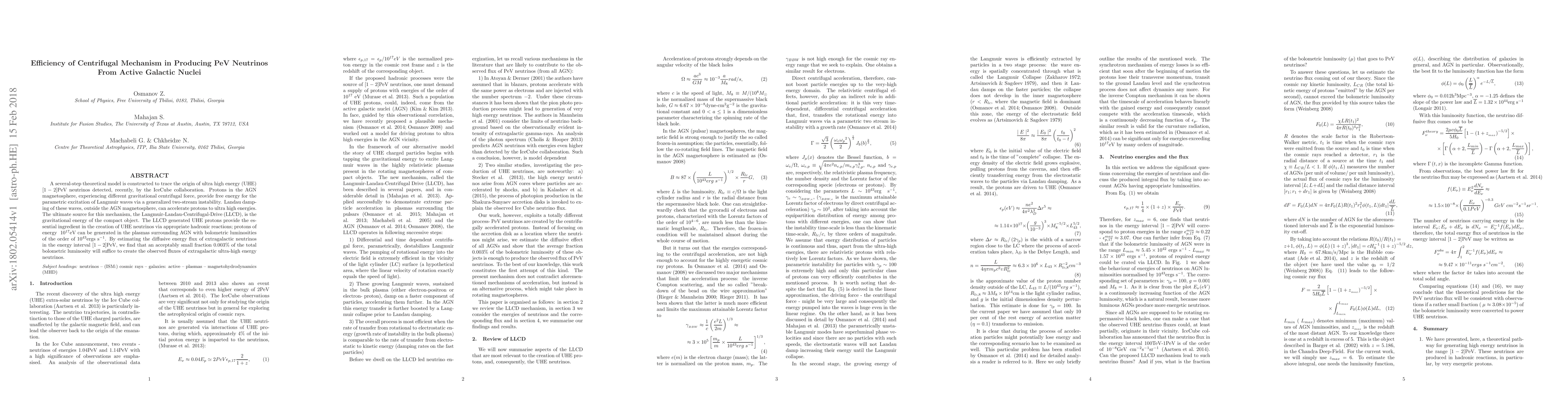 This paper proposes a theoretical model explaining the production of PeV neutrinos from active galactic nuclei (AGN) via a centrifugal mechanism. It suggests that protons in the AGN magnetosphere, driven by gravitational forces, generate Langmuir waves that accelerate protons to ultra-high energies, ultimately producing the observed PeV neutrinos. The study estimates that only a small fraction of the AGN's total luminosity is needed to create these neutrino fluxes.