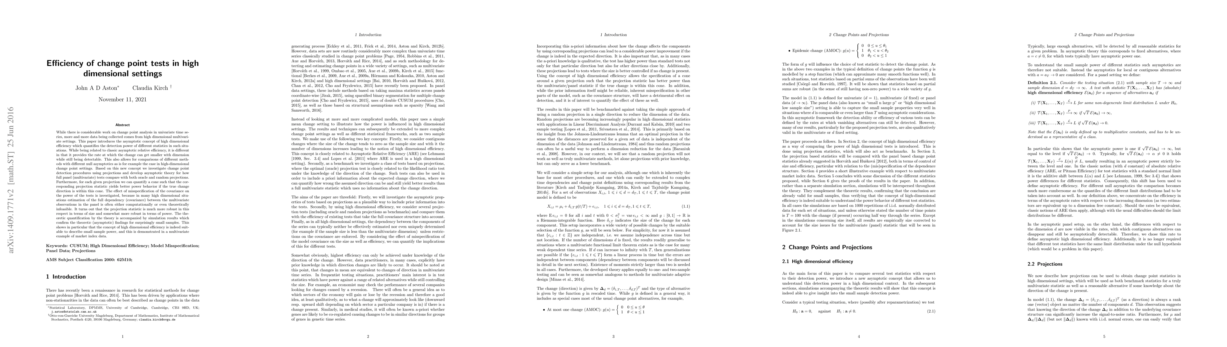 While there is considerable work on change point analysis in univariate time series, more and more data being collected comes from high dimensional multivariate settings. This paper introduces the asymptotic concept of high dimensional efficiency which quantifies the detection power of different statistics in such situations. While being related to classic asymptotic relative efficiency, it is different in that it provides the rate at which the change can get smaller with dimension while still being detectable. This also allows for comparisons of different methods with different null asymptotics as is for example the case in high-dimensional change point settings. Based on this new concept we investigate change point detection procedures using projections and develop asymptotic theory for how full panel (multivariate) tests compare with both oracle and random projections. Furthermore, for each given projection we can quantify a cone such that the corresponding projection statistic yields better power behavior if the true change direction is within this cone. The effect of misspecification of the covariance on the power of the tests is investigated, because in many high dimensional situations estimation of the full dependency (covariance) between the multivariate observations in the panel is often either computationally or even theoretically infeasible. It turns out that the projection statistic is much more robust in this respect in terms of size and somewhat more robust in terms of power. The theoretic quantification by the theory is accompanied by simulation results which confirm the theoretic (asymptotic) findings for surprisingly small samples. This shows in particular that the concept of high dimensional efficiency is indeed suitable to describe small sample power, and this is demonstrated in a multivariate example of market index data.
