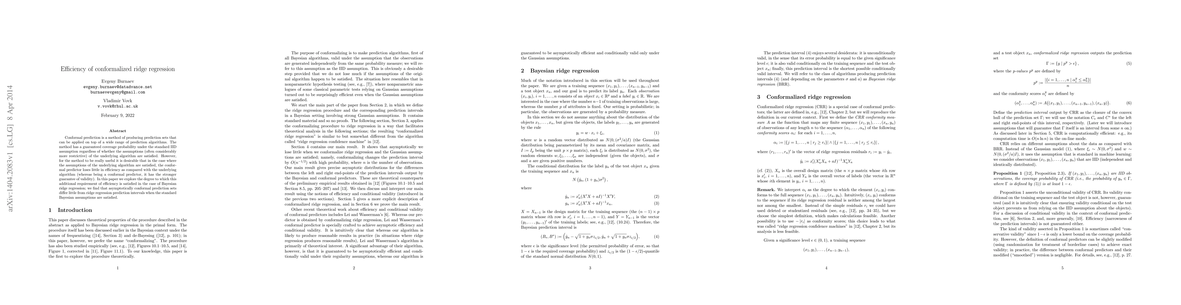 The paper presents a detailed analysis of the efficiency of conformalized ridge regression, providing a proof of asymptotic equivalence between conformal prediction sets and ridge regression intervals under standard assumptions.