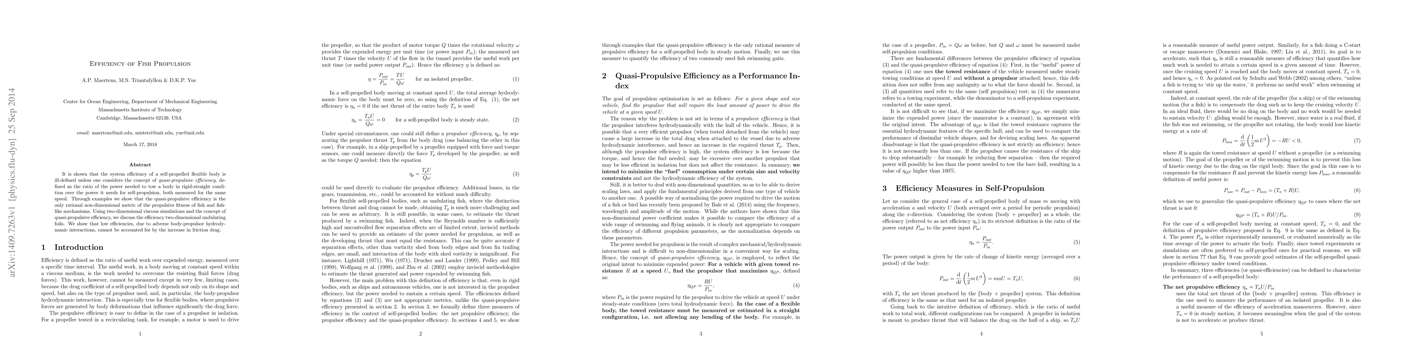 This paper introduces the concept of quasi-propulsive efficiency as a metric for evaluating the efficiency of fish propulsion, defined by comparing towing power to self-propulsion power at the same speed. It concludes that this metric is essential for assessing the propulsive fitness of fish and fish-like mechanisms, highlighting low efficiencies due to hydrodynamic interactions rather than friction drag.