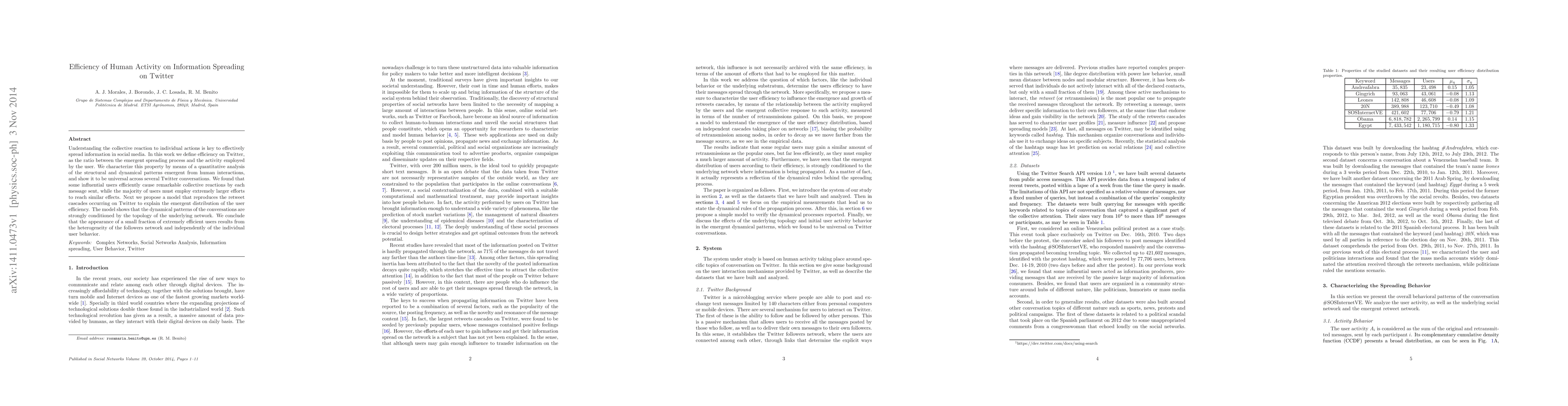This study examines how individual actions influence information spreading on Twitter, defining efficiency as the ratio of spreading to user activity. It finds that while some users cause significant collective reactions with minimal effort, most require much greater effort. The research proposes a model that reproduces retweet cascades and shows that network topology heavily conditions conversation dynamics, concluding that the presence of highly efficient users is due to network heterogeneity rather than individual behavior.
