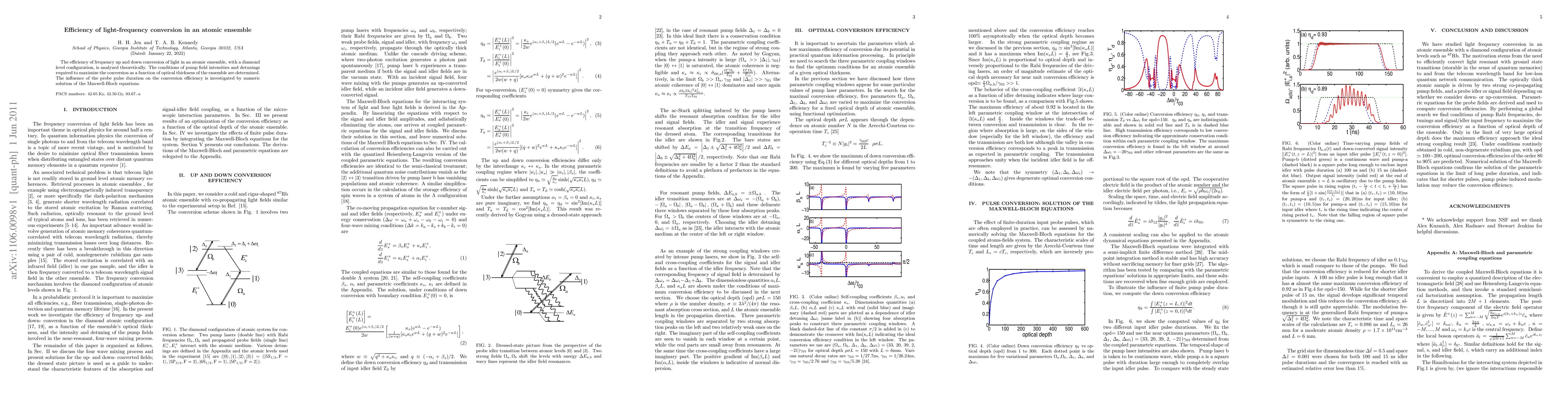 The efficiency of frequency up and down conversion of light in an atomic ensemble, with a diamond level configuration, is analyzed theoretically. The conditions of pump field intensities and detunings required to maximize the conversion as a function of optical thickness of the ensemble are determined. The influence of the probe pulse duration on the conversion efficiency is investigated by numeric solution of the Maxwell-Bloch equations.