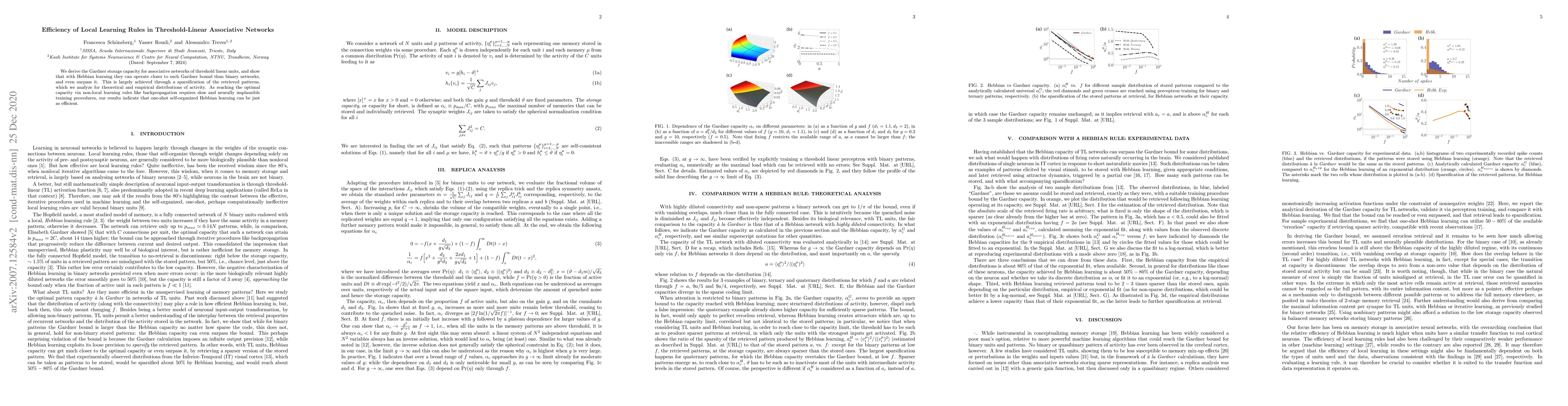 This paper demonstrates that threshold-linear associative networks using Hebbian learning can achieve higher storage capacity compared to binary networks, often surpassing the Gardner bound, due to pattern sparsification. It suggests that efficient, self-organized Hebbian learning is a viable alternative to slower, non-local learning methods like backpropagation.