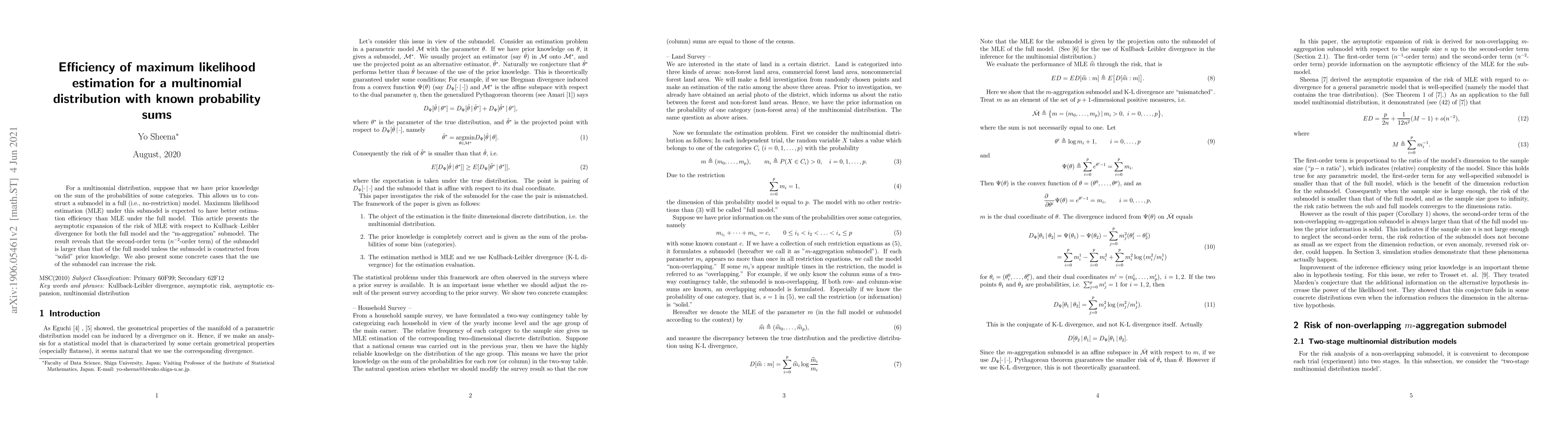For a multinomial distribution, suppose that we have prior knowledge of the sum of the probabilities of some categories. This allows us to construct a submodel in a full (i.e., no-restriction) model. Maximum likelihood estimation (MLE) under this submodel is expected to have better estimation efficiency than MLE under the full model. This article presents the asymptotic expansion of the risk of MLE with respect to Kullback--Leibler divergence for both the full model and submodel. The results reveal that, using the submodel, the reduction of the risk is quite small in some cases. Furthermore, when the sample size is small, the use of the subomodel can increase the risk.