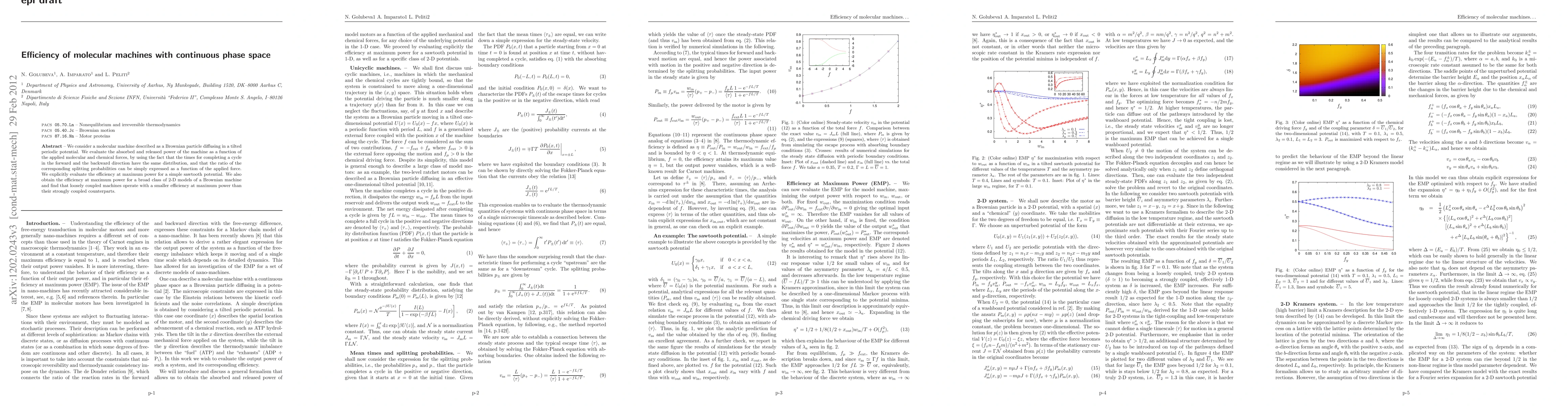 We consider a molecular machine described as a Brownian particle diffusing in a tilted periodic potential. We evaluate the absorbed and released power of the machine as a function of the applied molecular and chemical forces, by using the fact that the times for completing a cycle in the forward and the backward direction have the same distribution, and that the ratio of the corresponding splitting probabilities can be simply expressed as a function of the applied force. We explicitly evaluate the efficiency at maximum power for a simple sawtooth potential. We also obtain the efficiency at maximum power for a broad class of 2-D models of a Brownian machine and find that loosely coupled machines operate with a smaller efficiency at maximum power than their strongly coupled counterparts.
