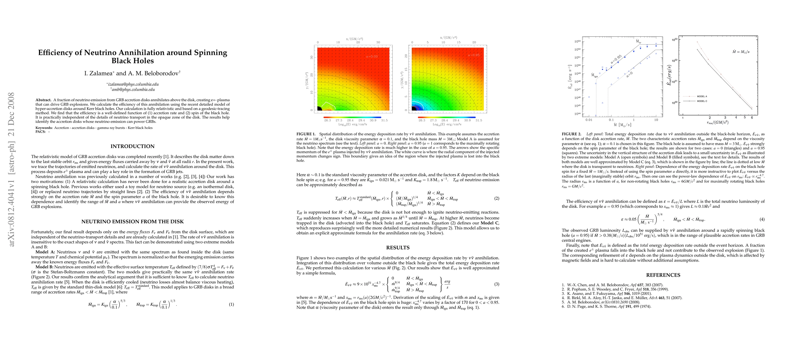 This paper calculates the efficiency of neutrino annihilation in hyper-accretion disks around spinning black holes, finding it depends on the accretion rate and black hole spin, but not on the specifics of neutrino transport. The results aid in identifying disks capable of powering gamma-ray bursts (GRBs).