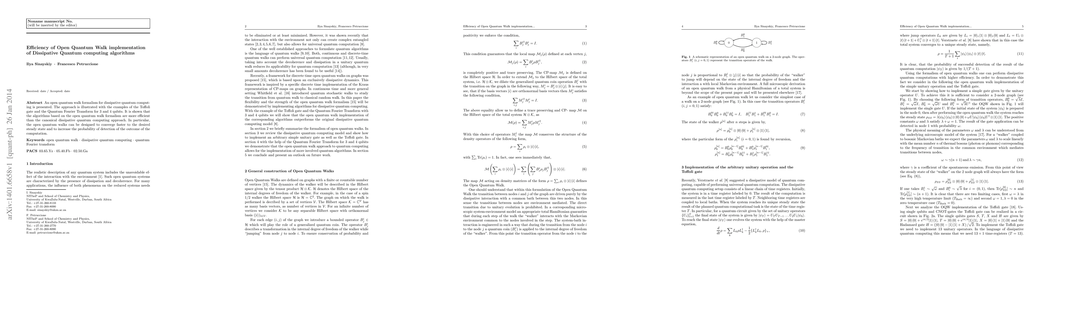 This paper presents an open quantum walk formalism for dissipative quantum computing, demonstrating its efficiency through examples like the Toffoli gate and Quantum Fourier Transform. The proposed approach shows faster convergence and higher outcome detection probability compared to traditional methods.