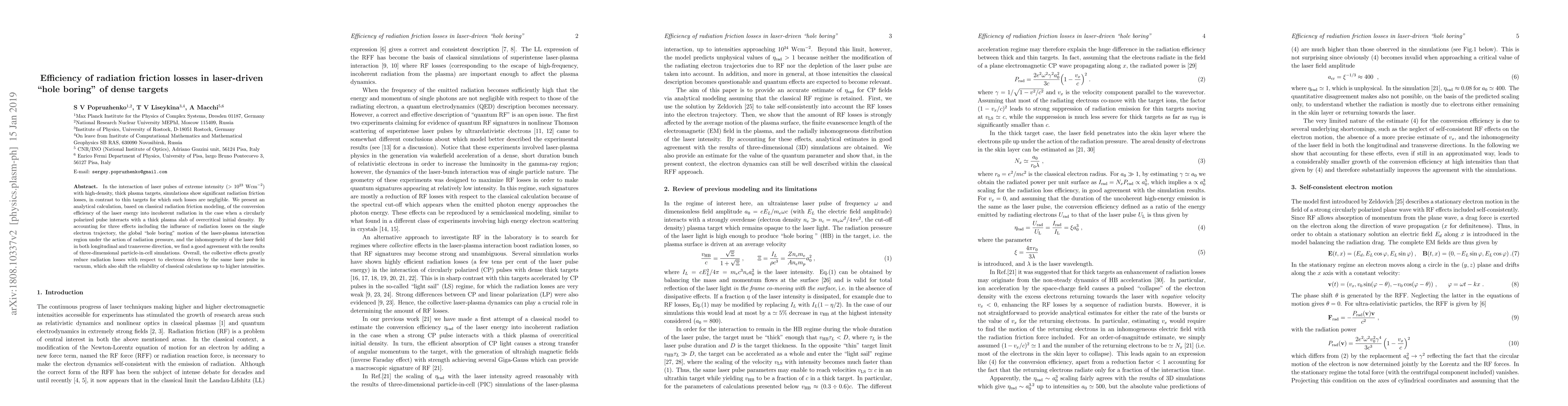 This paper presents an analytical model to calculate the efficiency of radiation friction losses in laser-driven "hole boring" of dense plasma targets, showing significant losses in contrast to thin targets. The model accounts for electron trajectory, global motion, and laser field inhomogeneity, aligning well with simulation results.