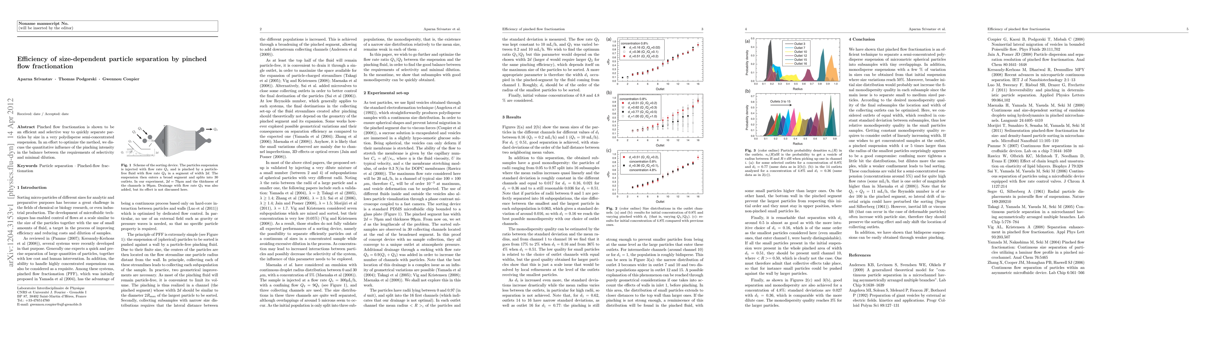 Summary: Pinched flow fractionation effectively separates particles by size in a polydisperse suspension, with optimization focusing on the balance between pinching intensity, selectivity, and minimal dilution. This method offers a promising approach for size-dependent particle separation.