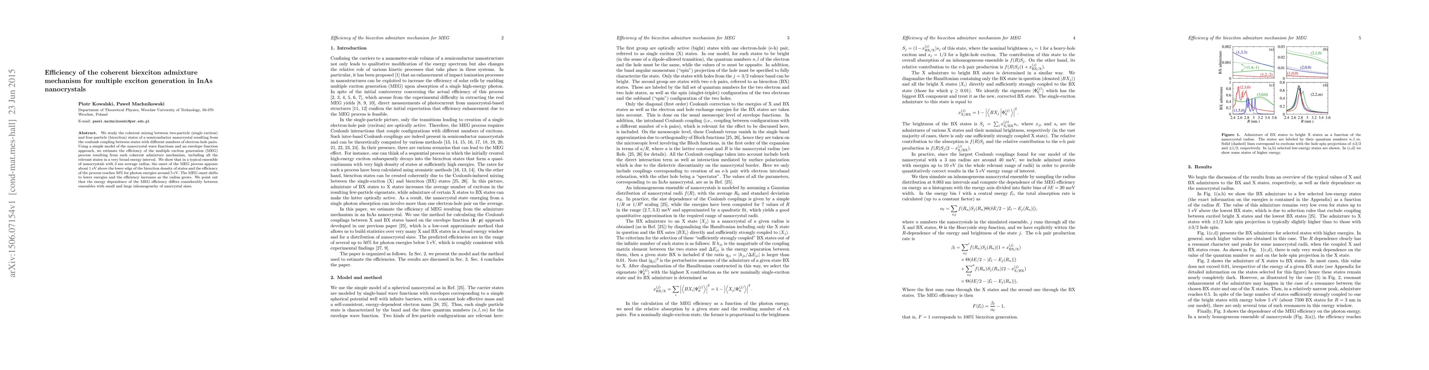 We study the coherent mixing between two-particle (single exciton) and four-particle (biexciton) states of a semiconductor nanocrystal resulting from the coulomb coupling between states with different numbers of electron-hole pairs. Using a simple model of the nanocrystal wave functions and an envelope function approach, we estimate the efficiency of the multiple exciton generation (MEG) process resulting from such coherent admixture mechanism, including all the relevant states in a very broad energy interval. We show that in a typical ensemble of nanocrystals with 3~nm average radius, the onset of the MEG process appears about 1~eV above the lower edge of the biexciton density of states and the efficiency of the process reaches 50\% for photon energies around 5~eV. The MEG onset shifts to lower energies and the efficiency increases as the radius grows. We point out that the energy dependence of the MEG efficiency differs considerably between ensembles with small and large inhomogeneity of nancrystal sizes.