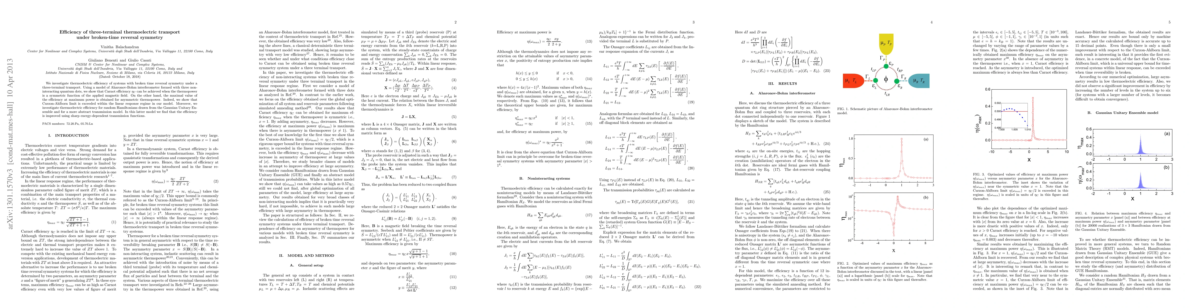 This paper explores the thermoelectric efficiency in three-terminal systems with broken time reversal symmetry, demonstrating that Carnot efficiency is achievable under symmetric thermopower, while the Curzon-Ahlborn limit can be exceeded for asymmetric thermopower. It also examines efficiencies in random and abstract models, finding improved efficiency through sharp energy-dependent transmission functions.