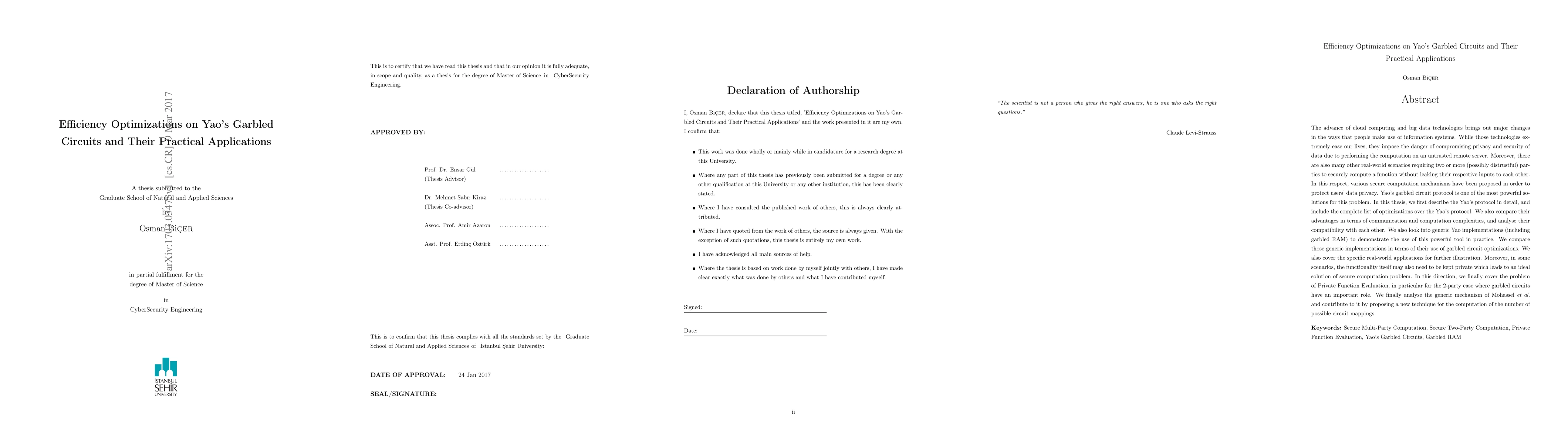 This paper explores optimizations for Yao's garbled circuit protocol to enhance secure computation in cloud computing and big data environments, comparing various optimizations in terms of communication and computational efficiency. It also examines practical implementations and real-world applications, including the novel approach to Private Function Evaluation.