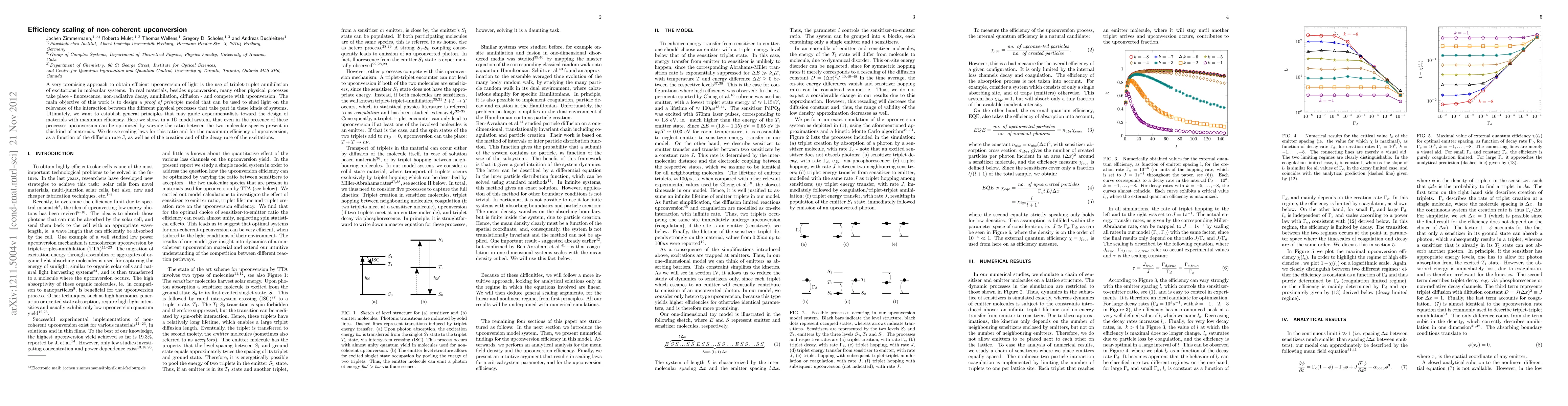 A very promising approach to obtain efficient upconversion of light is the use of triplet-triplet annihilation of excitations in molecular systems. In real materials, besides upconversion, many other physical processes take place - fluorescence, non-radiative decay, annihilation, diffusion - and compete with upconversion. The main objective of this work is to design a proof of principle model that can be used to shed light on the relevance of the interaction between the different physical processes that take part in these kinds of systems. Ultimately, we want to establish general principles that may guide experimentalists toward the design of materials with maximum efficiency. Here we show, in a 1D model system, that even in the presence of these processes upconversion can be optimized by varying the ratio between the two molecular species present in this kind of materials. We derive scaling laws for this ratio and for the maximum efficiency of upconversion, as a function of the diffusion rate J, as well as of the creation and of the decay rate of the excitations.