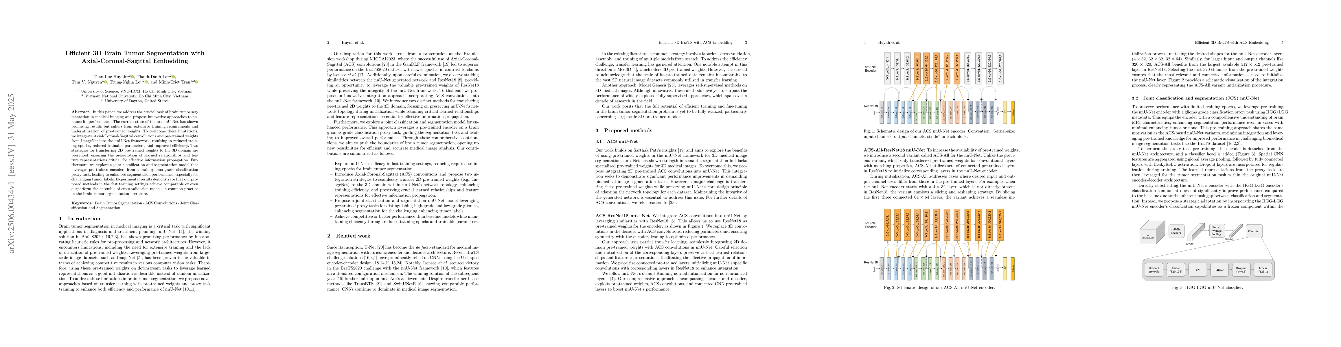 In this paper, we address the crucial task of brain tumor segmentation in medical imaging and propose innovative approaches to enhance its performance. The current state-of-the-art nnU-Net has shown promising results but suffers from extensive training requirements and underutilization of pre-trained weights. To overcome these limitations, we integrate Axial-Coronal-Sagittal convolutions and pre-trained weights from ImageNet into the nnU-Net framework, resulting in reduced training epochs, reduced trainable parameters, and improved efficiency. Two strategies for transferring 2D pre-trained weights to the 3D domain are presented, ensuring the preservation of learned relationships and feature representations critical for effective information propagation. Furthermore, we explore a joint classification and segmentation model that leverages pre-trained encoders from a brain glioma grade classification proxy task, leading to enhanced segmentation performance, especially for challenging tumor labels. Experimental results demonstrate that our proposed methods in the fast training settings achieve comparable or even outperform the ensemble of cross-validation models, a common practice in the brain tumor segmentation literature.