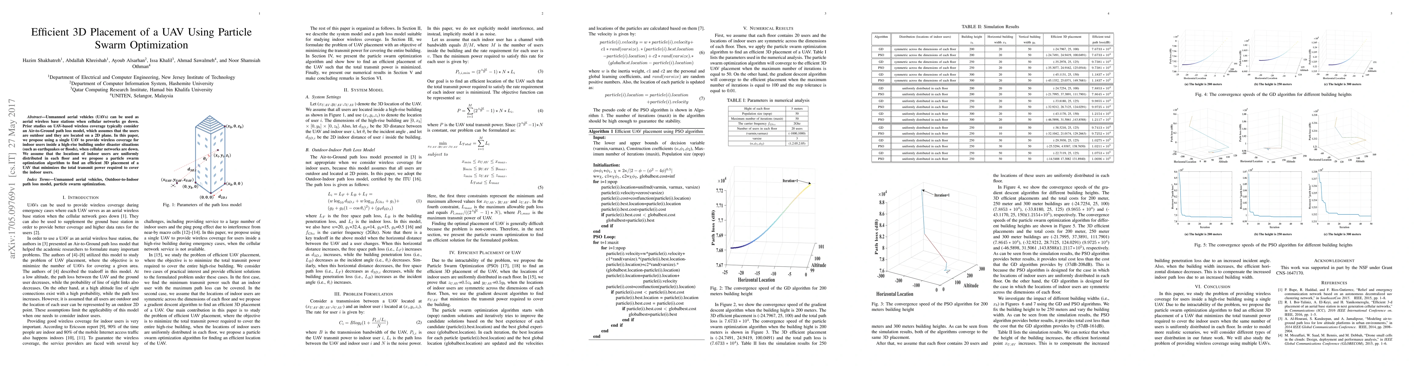 The paper presents a Particle Swarm Optimization algorithm tailored for efficient 3D UAV placement to minimize transmit power for indoor wireless coverage in high-rise buildings.