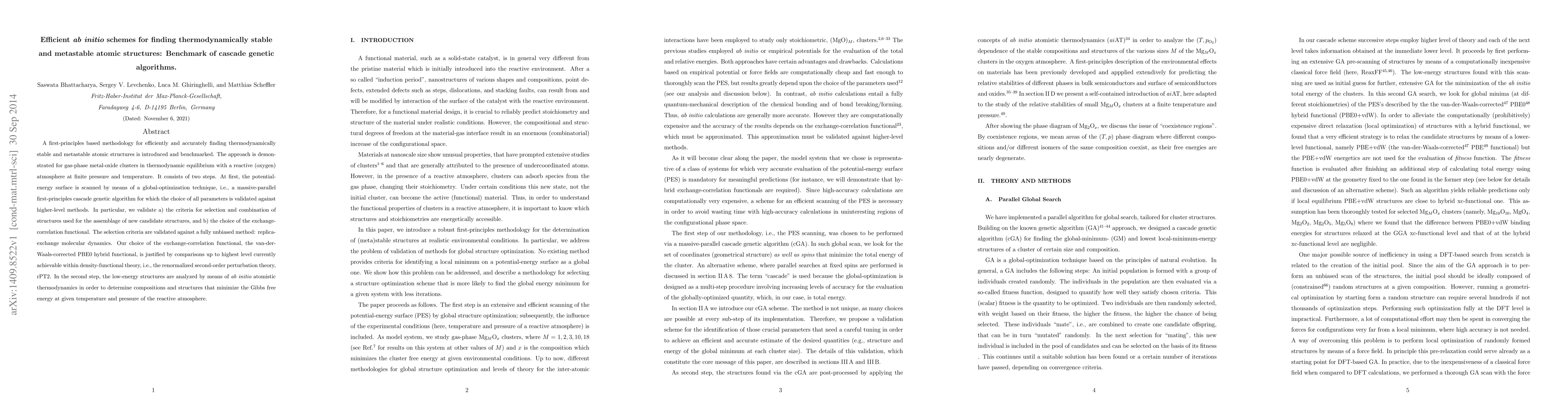 A first-principles based methodology for efficiently and accurately finding thermodynamically stable and metastable atomic structures is introduced and benchmarked. The approach is demonstrated for gas-phase metal-oxide clusters in thermodynamic equilibrium with a reactive (oxygen) atmosphere at finite pressure and temperature. It consists of two steps. At first, the potential-energy surface is scanned by means of a global-optimization technique, i.e., a massive-parallel first-principles cascade genetic algorithm for which the choice of all parameters is validated against higher-level methods. In particular, we validate a) the criteria for selection and combination of structures used for the assemblage of new candidate structures, and b) the choice of the exchange-correlation functional. The selection criteria are validated against a fully unbiased method: replica-exchange molecular dynamics. Our choice of the exchange-correlation functional, the van-der-Waals-corrected PBE0 hybrid functional, is justified by comparisons up to highest level currently achievable within density-functional theory, i.e., the renormalized second-order perturbation theory, rPT2. In the second step, the low-energy structures are analyzed by means of ab initio atomistic thermodynamics in order to determine compositions and structures that minimize the Gibbs free energy at given temperature and pressure of the reactive atmosphere.
