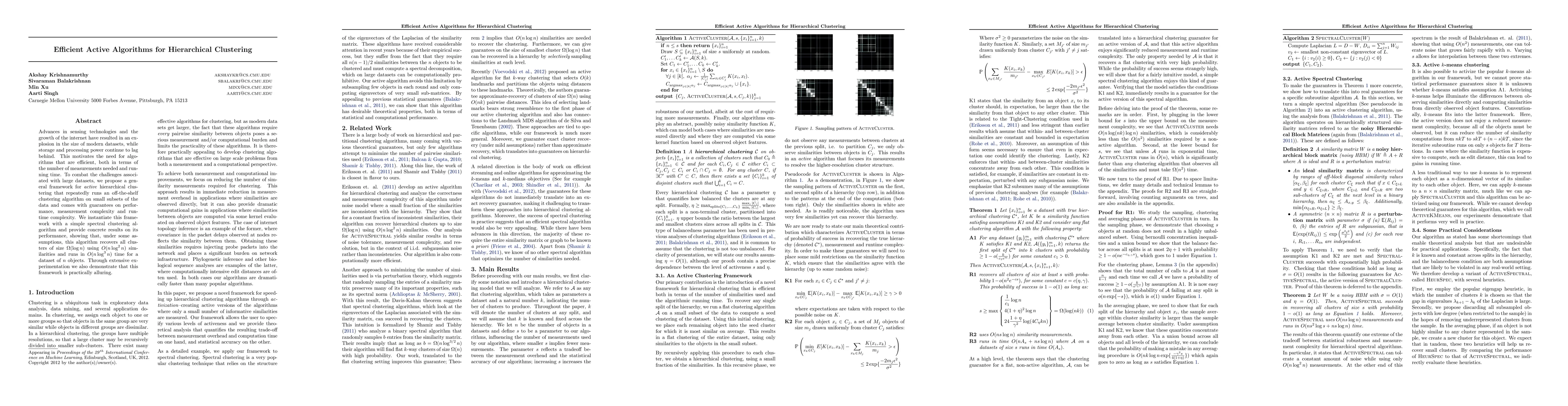 This paper proposes an efficient active hierarchical clustering framework that leverages small subsets of data to manage large datasets. It demonstrates a practical spectral clustering instantiation that achieves O(n log^2 n) similarities and O(n log^3 n) runtime for datasets of n objects, showing promising results through extensive experimentation.
