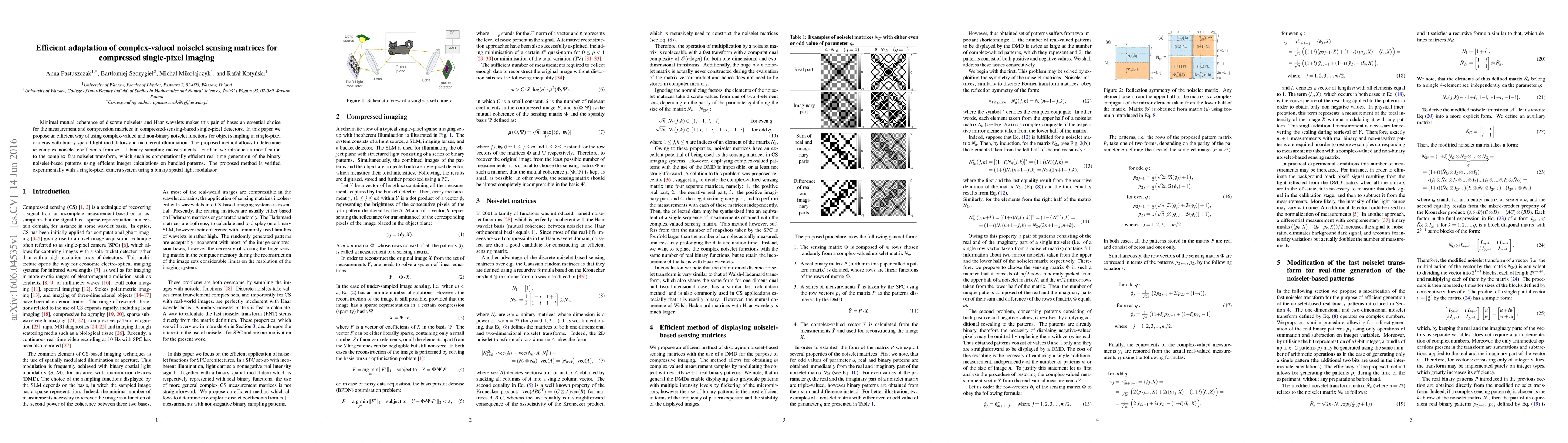 This paper proposes an efficient method for using complex-valued noiselet sensing matrices in compressed single-pixel imaging, enabling the determination of complex noiselet coefficients from binary sampling measurements. The method includes a modified complex fast noiselet transform for real-time generation of binary patterns, verified experimentally with a single-pixel camera system.