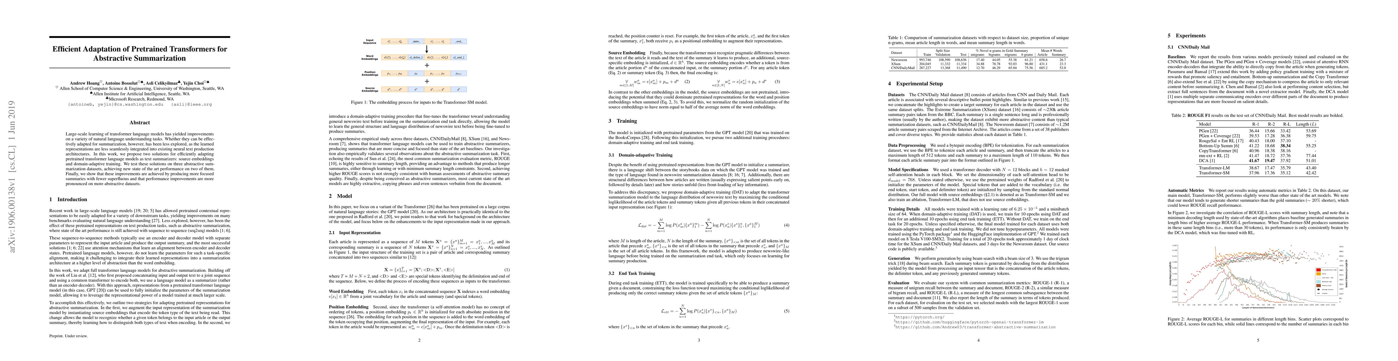 This paper proposes two methods—source embeddings and domain-adaptive training—to efficiently adapt pretrained transformer models for abstractive summarization. The methods achieve state-of-the-art results on two datasets, producing more focused and fewer superfluous summaries, with better performance on more abstractive tasks.