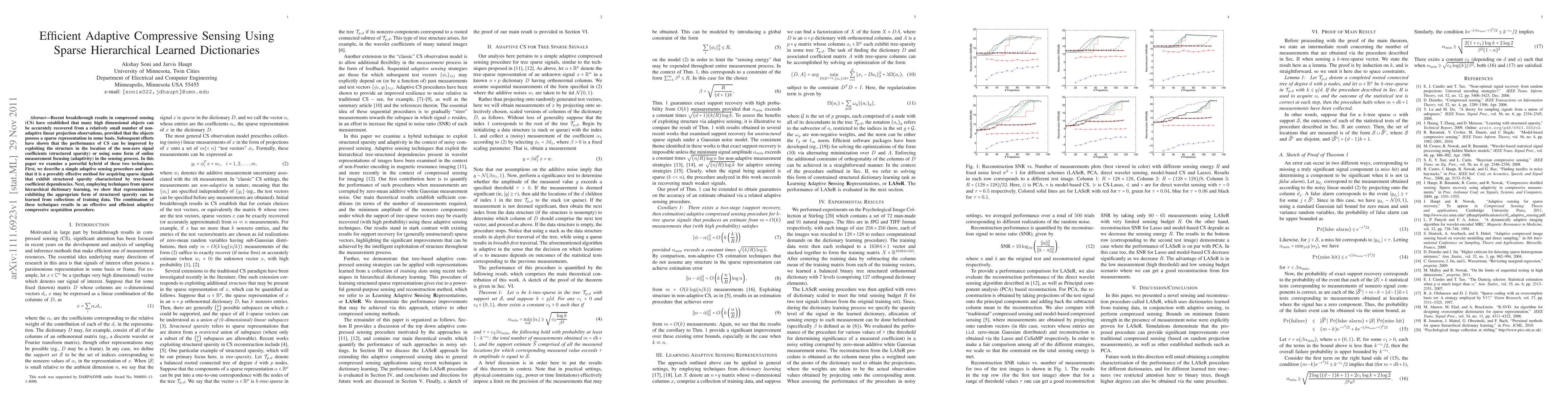 This paper proposes an adaptive compressive sensing method that combines adaptive measurement focusing with sparse hierarchical dictionary learning to efficiently recover sparse signals with structured sparsity. The approach leverages tree-based coefficient dependencies and learned dictionaries to achieve effective signal acquisition from fewer observations.