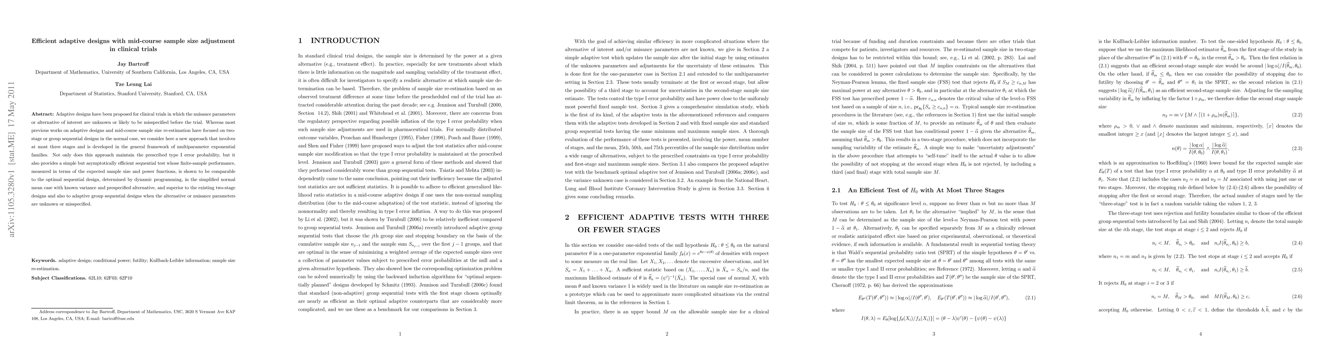 This paper proposes a new adaptive design for clinical trials that allows for mid-course sample size adjustment in up to three stages, maintaining type I error probability while providing an efficient sequential test. The approach outperforms existing two-stage and adaptive group sequential designs, especially when parameters are unknown or misspecified.