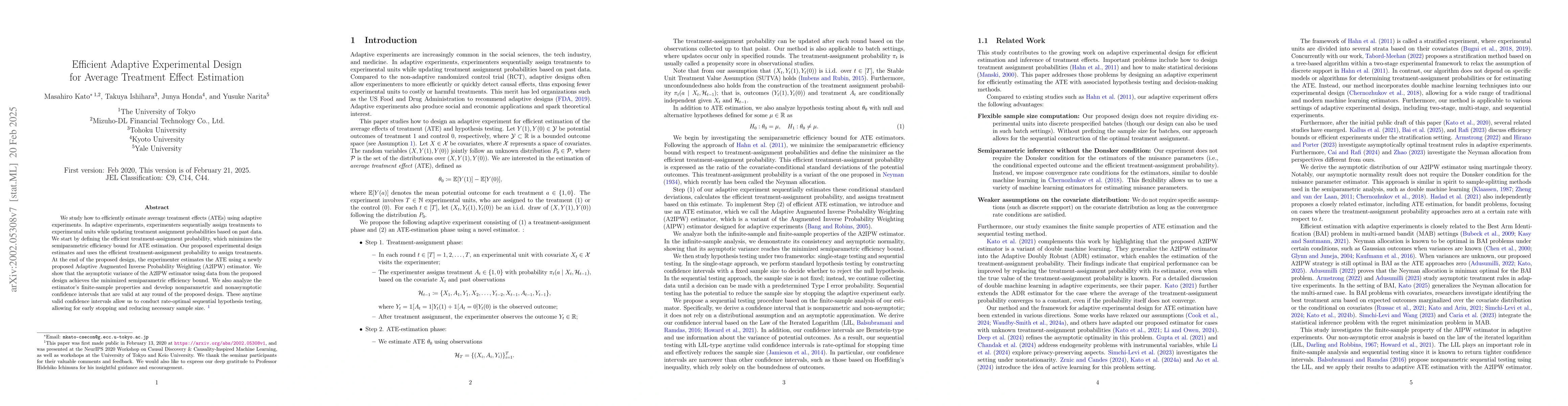 This paper proposes an adaptive experimental design algorithm for efficiently estimating the average treatment effect (ATE) in sequential experiments, addressing the challenge of dependent samples. The authors introduce a new estimator and a sequential testing framework, supported by both theoretical and empirical analyses, demonstrating improved performance.