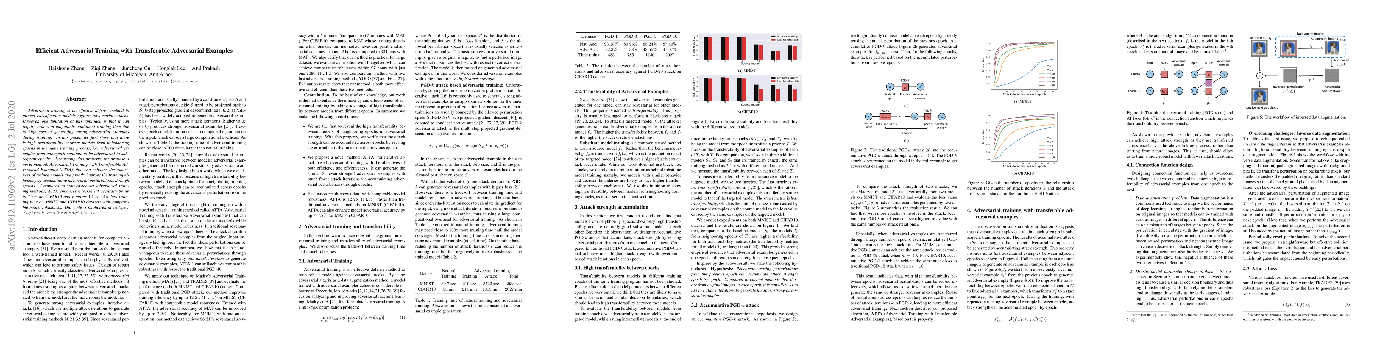 This paper proposes Adversarial Training with Transferable Adversarial Examples (ATTA) to enhance model robustness while significantly reducing training time. It leverages the transferability of adversarial examples across training epochs, thereby improving efficiency and achieving up to 7.2% higher adversarial accuracy on CIFAR10.