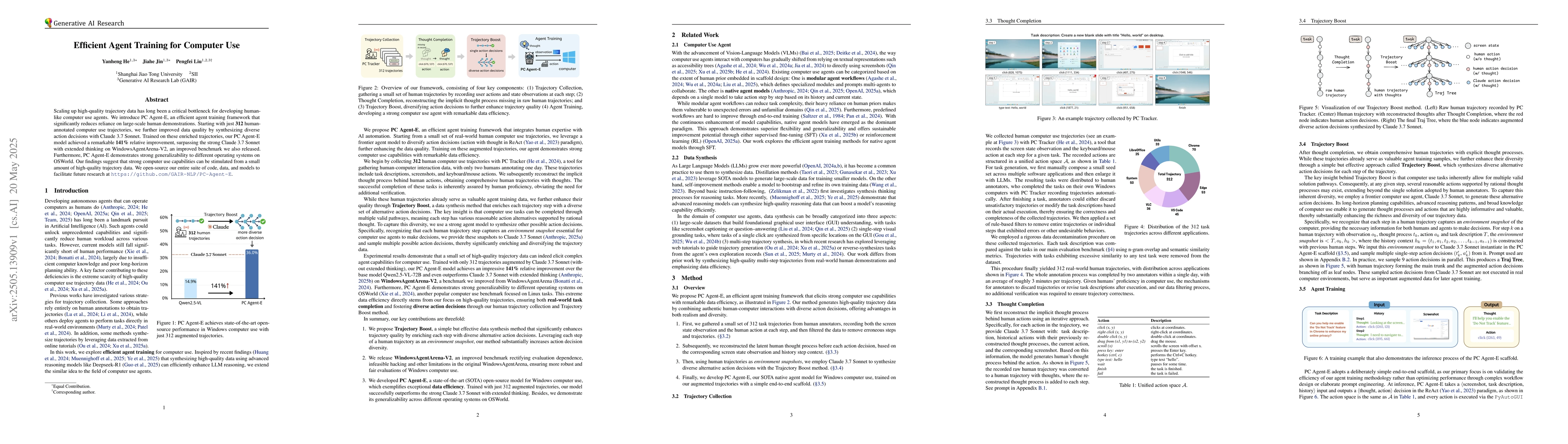 The research introduces PC Agent-E, a framework that minimizes the need for extensive human demonstration data by enhancing a small set (312) of human-annotated trajectories with synthetic data generated by Claude 3.7 Sonnet.