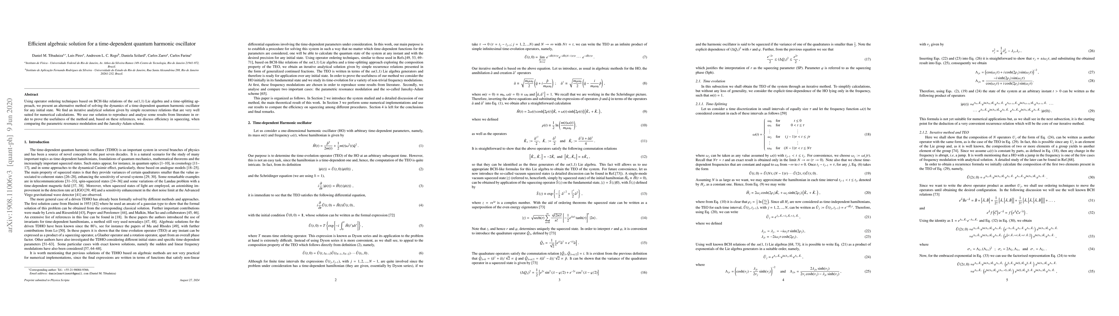 Using operator ordering techniques based on BCH-like relations of the su(1,1) Lie algebra and a time-splitting approach,we present an alternative method of solving the dynamics of a time-dependent quantum harmonic oscillator for any initial state. We find an iterative analytical solution given by simple recurrence relations that are very well suited for numerical calculations. We use our solution to reproduce and analyse some results from literature in order to prove the usefulness of the method and, based on these references, we discuss efficiency in squeezing, when comparing the parametric resonance modulation and the Janszky-Adam scheme.