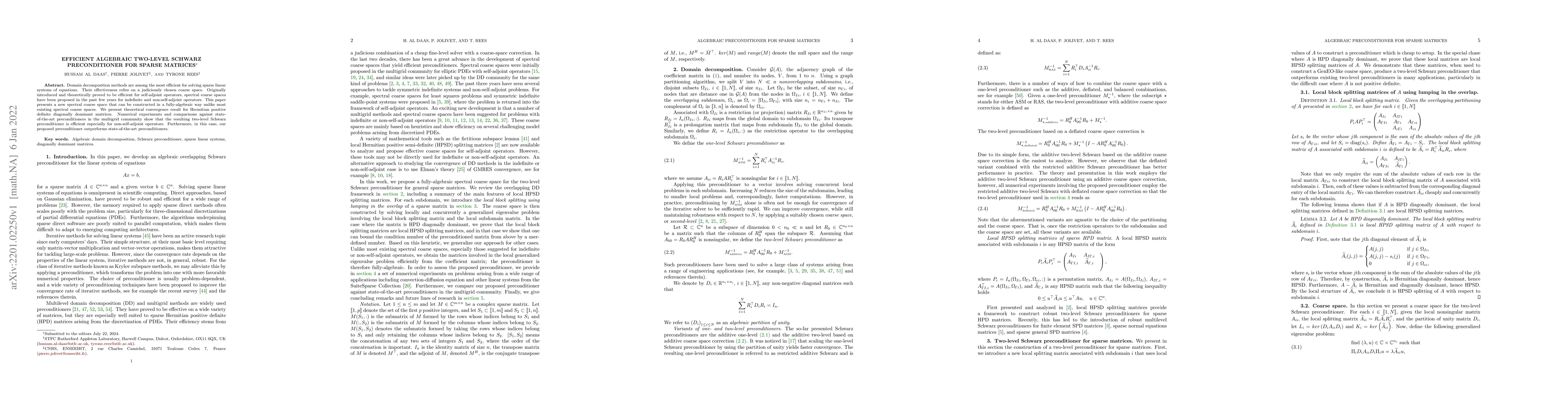 The paper presents a fully algebraic two-level Schwarz preconditioner for large-scale sparse matrices, combining a classic one-level Schwarz preconditioner with an efficiently constructed spectral coarse space.