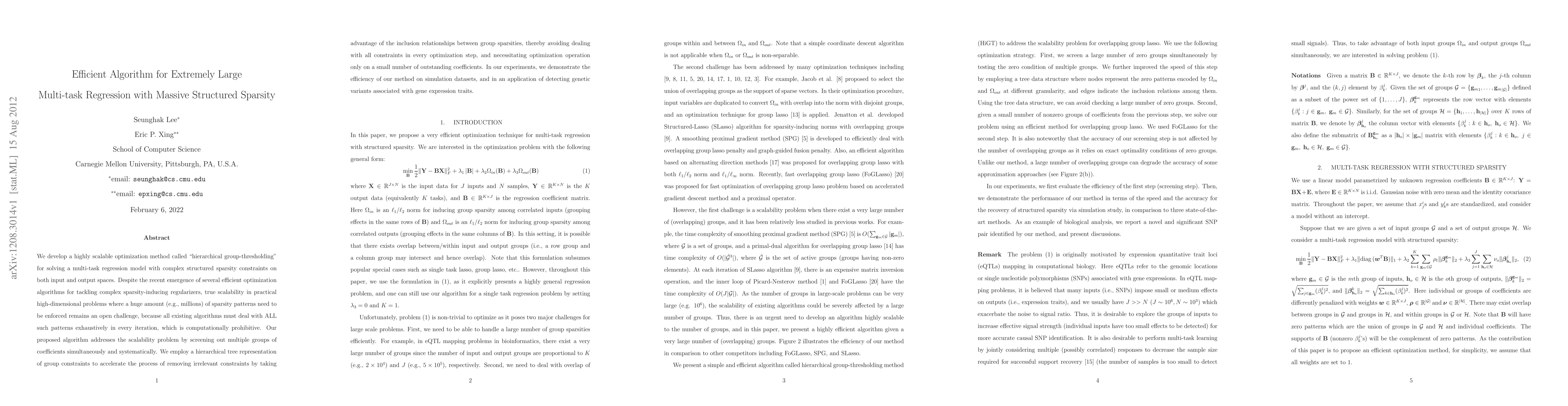 We develop a highly scalable optimization method called "hierarchical group-thresholding" for solving a multi-task regression model with complex structured sparsity constraints on both input and output spaces. Despite the recent emergence of several efficient optimization algorithms for tackling complex sparsity-inducing regularizers, true scalability in practical high-dimensional problems where a huge amount (e.g., millions) of sparsity patterns need to be enforced remains an open challenge, because all existing algorithms must deal with ALL such patterns exhaustively in every iteration, which is computationally prohibitive. Our proposed algorithm addresses the scalability problem by screening out multiple groups of coefficients simultaneously and systematically. We employ a hierarchical tree representation of group constraints to accelerate the process of removing irrelevant constraints by taking advantage of the inclusion relationships between group sparsities, thereby avoiding dealing with all constraints in every optimization step, and necessitating optimization operation only on a small number of outstanding coefficients. In our experiments, we demonstrate the efficiency of our method on simulation datasets, and in an application of detecting genetic variants associated with gene expression traits.