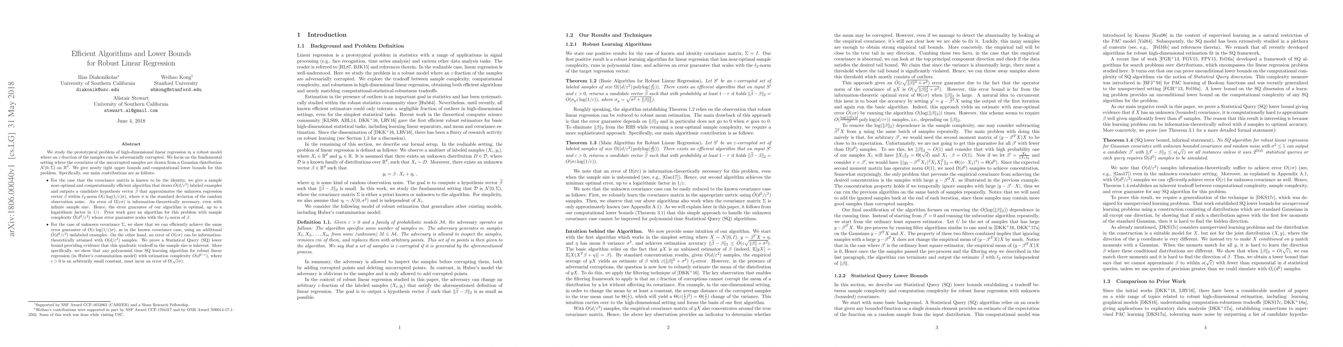 This paper investigates robust high-dimensional linear regression under adversarial corruption, presenting efficient algorithms and proving lower bounds. It provides near-optimal algorithms for both known and unknown covariance scenarios, demonstrating a quadratic tradeoff in sample size and establishing a Statistical Query lower bound for polynomial time algorithms.
